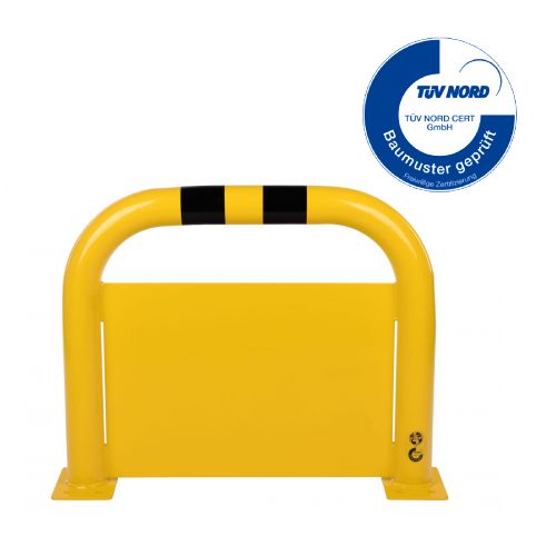 Metāla aizsargbarjera – dzeltena (RAL 1023) ar melnām atstarojošām joslām. Krāsota. Piemērota izmantošanai iekštlepās. Izmēri: platums 750mm, augstums 600mm, apakšējā aizsarga augstums 400mm, metāla biezums 3,2mm. Caurules diametrs – 76mm. Barjera izgatavota ar lieces tehnoloģiju – bez metinājuma šuvēm. Pamatnes izmērs: 120x195mm. Stiprināšana pie zemes ar 8 skrūvēm d=12,5mm (nav iekļautas komplektā!). TÜV sertifikāts. Svars: 18kg.