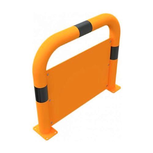 Metāla aizsargbarjera ar aizsargplāksni – oranži dzeltena ar melnām joslām. Karsti cinkota un krāsota. Piemērota izmantošanai iekštelpās un ārā. Izmēri: platums 750mm, augstums 650mm. Caurules diametrs – 76mm. Pamatnes izmērs: 100x150mm. Stiprināšana pie zemes ar 8 skrūvēm (nav iekļautas komplektā!). Svars: 17kg.