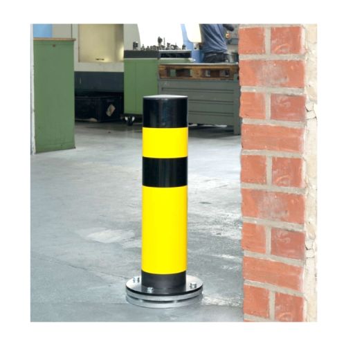 Metāla aizsargstabs, rotējošs (tērauda pamatplāksne ar 6 lodīšu gultņiem). Krāsots dzeltenmelns. Elastīgs. Stabs noliecas maksimāli līdz 25 grādiem un automātiski atgriežas sākuma pozīcijā. Stiprināms pie pamatnes ar 4 skrūvēm (komplektā nav iekļautas!). Izmēri: staba d=159mm, h=1000mm, staba materiāla biezums 4.5mm, pamata plāksnes izmērs d=270mm. Pielietojams iekštelpās (nav cinkots). Svars: 42kg. Atsevišķi var iegādāties iebetonējamu metāla pēdu.