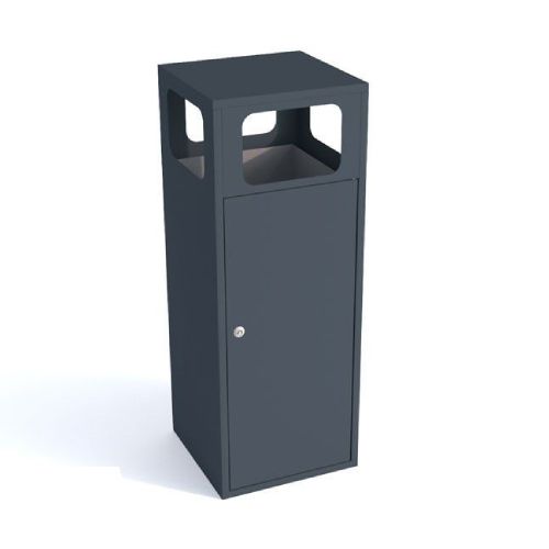 Metāla atkritumu tvertne ar atkritumu iemešanu no 4 sāniem. Tilpums: 120l. Izmēri: platums 450mm, dziļums 440mm, augstums 1100mm. Izgatavota no 1mm tērauda lokšņu materiāla. Viegla atkritumu iztukšošana (no sāna). Cinkota un krāsota RAL 7021 tonī. Pieejams arī nerūsējošā tērauda variants. Piemērota parkos, skvēros, māju pagalmos, autobusu pieturās, gājēju celiņu malās u.c.