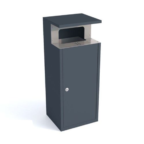 Metāla atkritumu tvertne ar pelnu trauku (nerūsējošā tērauda). Tilpums: 80l. Cinkota un krāsota tonī RAL 7021 (iespēja izvēlēties atkritumu ejas elementa krāsu: melna RAL 9005; grafīta pelēka RAL 7021; sudraba pelēka RAL 9006; pelēka RAL 9007; brūna RAL 8011; dzeltena RAL 1023; zaļa RAL 6018; sarkana RAL 3002; oranža RAL 2000, zila RAL 5015). Izmēri: platums 390mm, dziļums 380mm, augstums 1040mm. Izgatavota no 1mm tērauda lokšņu materiāla. Viegla atkritumu iztukšošana (no sāna). Piemērota parkos, skvēros, māju pagalmos, autobusu pieturās, gājēju celiņu malās u.c.
