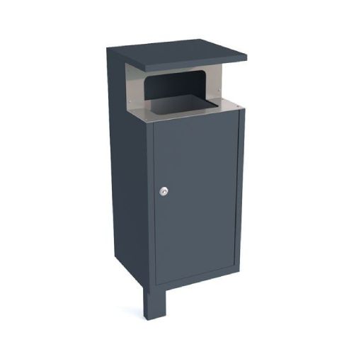 Metāla atkritumu tvertne. Betonējama. Tilpums: 80l. Cinkota un krāsota tonī RAL 7021 (iespēja izvēlēties atkritumu ejas elementa krāsu: melna RAL 9005; grafīta pelēka RAL 7021; sudraba pelēka RAL 9006; pelēka RAL 9007; brūna RAL 8011; dzeltena RAL 1023; zaļa RAL 6018; sarkana RAL 3002; oranža RAL 2000, zila RAL 5015). Izmēri: platums 390mm, dziļums 380mm, augstums 1200mm. Iekšējās kastes izmēri: 295x350x780mm. Izgatavota no 1mm tērauda lokšņu materiāla. Viegla atkritumu iztukšošana (no sāna). Piemērota parkos, skvēros, māju pagalmos, autobusu pieturās, gājēju celiņu malās u.c.