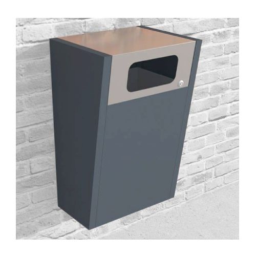 Metāla atkritumu tvertne. Stiprināma pie sienas, ar atveramu vāku. Tilpums: 80l. Cinkota un krāsota tonī RAL 7021 (iespēja izvēlēties atkritumu ejas elementa krāsu: melna RAL 9005; grafīta pelēka RAL 7021; sudraba pelēka RAL 9006; pelēka RAL 9007; brūna RAL 8011; dzeltena RAL 1023; zaļa RAL 6018; sarkana RAL 3002; oranža RAL 2000, zila RAL 5015). Izmēri: platums 390mm, dziļums 380mm, augstums 1040mm. Iekšējās kastes izmēri: 295x350x780mm. Izgatavota no 1mm tērauda lokšņu materiāla. Viegla atkritumu iztukšošana (no augšas, atverot vāku). Piemērota parkos, skvēros, māju pagalmos, autobusu pieturās, gājēju celiņu malās u.c.