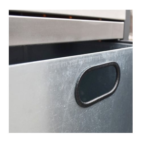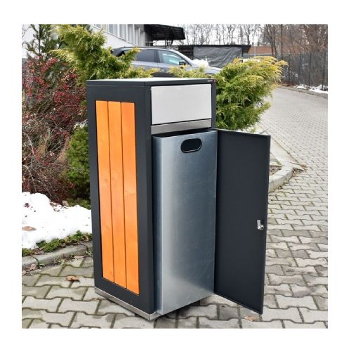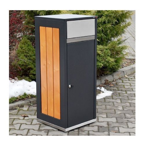 Metāla atkritumu tvertne ar koka elementiem un atloka vāku. Tilpums: 120l. Izmēri: platums 450mm, dziļums 440mm, augstums 1100mm. Izgatavota no 1mm tērauda lokšņu materiāla. Viegla atkritumu iztukšošana (no sāna). Cinkota un krāsota RAL 7021 tonī (pieejamie toņi: melna RAL 9005; grafīta pelēka RAL 7021; sudraba pelēka RAL 9006; pelēka RAL 9007; brūna RAL 8011; dzeltena RAL 1023; zaļa RAL 6018; sarkana RAL 3002; oranža RAL 2000). Pieejams arī nerūsējošā tērauda variants. Koka dēlīšu pieejamie toņi: gaišs ozols vai palisandrs (tumšs). Piemērota parkos, skvēros, māju pagalmos, autobusu pieturās, gājēju celiņu malās u.c.