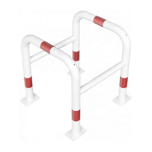 Metāla kvadrātveida aizsargbarjera – balta ar sarkanām joslām. Karsti cinkota. Montējama pie pamatnes ar 16 skrūvēm (nav iekļautas komplektā!). Izmēri: platums 800mm, dziļums 800mm, augstums 800mm. Caurules d=60mm, šķērseniskā caurule d=48mm. Svars: 24kg.