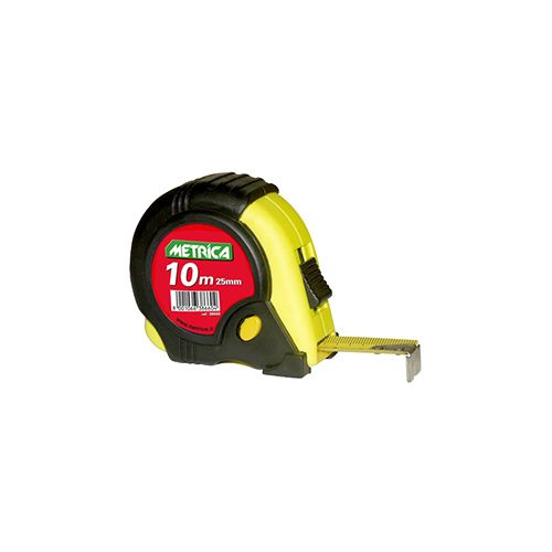 Metāla mērlenta. Garums: 10m. Lentas platums: 25mm. Trīs fiksēšanas pogas.