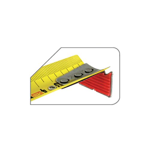 Metāla mērlenta ar pretnodiluma neilona pārklājumu. Garums: 5m. Lentas platums: 19mm. Mērlentas korpusa garums 65mm. Automātiska pārtīšana. Lentas nostiprināšanas slēdzis. Ar klipsi. Gumijas klipša pamatne, viegla aizāķēšana arī aiz apaļām virsmām.