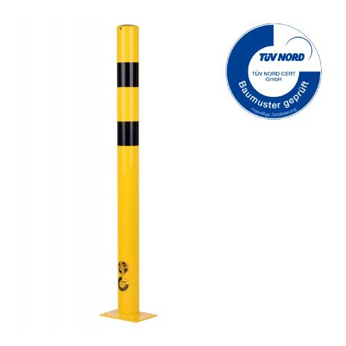 Metāla stabiņš – dzeltens (RAL 1023) ar melnām atstarojošām joslām. Cinkots un krāsots. Piemērots izmantošanai ārā. Izmēri: augstums 1200mm, metāla biezums 3,6mm. Caurules diametrs – 89mm. Pamatnes izmērs: 140x195mm. Stiprināšana pie zemes ar 4 skrūvēm d=12,5mm (nav iekļautas komplektā!). TÜV sertifikāts. Svars: 9,9kg.