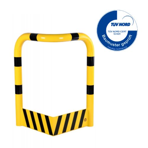 Metāla stūru aizsargbarjera – dzeltena (RAL 1023) ar melnām atstarojošām joslām. Cinkota un krāsota. Piemērota izmantošanai ārā. Izmēri: platums uz abām pusēm 600mm, augstums 1000mm, apakšējā aizsarga augstums 200mm, metāla biezums 3,2mm. Caurules diametrs – 76mm. Barjera izgatavota ar lieces tehnoloģiju – bez metinājuma šuvēm. Pamatnes izmērs: 120x195mm. Stiprināšana pie zemes ar 12 skrūvēm d=12,5mm (nav iekļautas komplektā!). TÜV sertifikāts. Svars: 28,7kg.