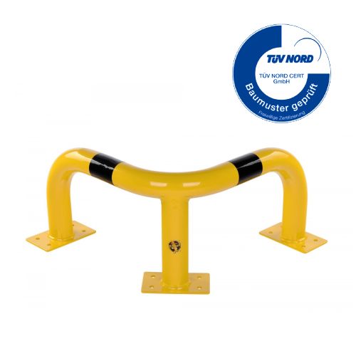 Metāla stūru aizsargbarjera – dzeltena (RAL 1023) ar melnām atstarojošām joslām. Cinkota un krāsota. Piemērota izmantošanai ārā. Izmēri: platums 600mm, augstums 350mm, metāla biezums 3,2mm. Caurules diametrs – 76mm. Barjera izgatavota ar lieces tehnoloģiju – bez metinājuma šuvēm. Pamatnes izmērs: 120x195mm. Stiprināšana pie zemes ar 12 skrūvēm d=12,5mm (nav iekļautas komplektā!). TÜV sertifikāts. Svars: 12,9kg.