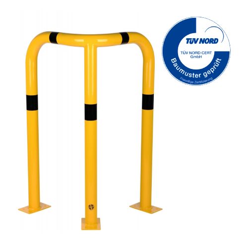 Metāla stūru aizsargbarjera – dzeltena (RAL 1023) ar melnām atstarojošām joslām. Cinkota un krāsota. Piemērota izmantošanai ārā. Izmēri: platums 600mm, augstums 1200mm, metāla biezums 3,2mm. Caurules diametrs – 76mm. Barjera izgatavota ar lieces tehnoloģiju – bez metinājuma šuvēm. Pamatnes izmērs: 120x195mm. Stiprināšana pie zemes ar 12 skrūvēm d=12,5mm (nav iekļautas komplektā!). TÜV sertifikāts. Svars: 27,9kg.