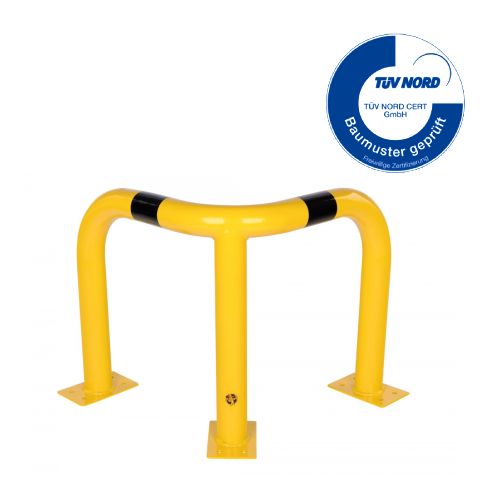 Metāla stūru aizsargbarjera – dzeltena (RAL 1023) ar melnām atstarojošām joslām. Cinkota un krāsota. Piemērota izmantošanai ārā. Izmēri: platums 600mm, augstums 600mm, metāla biezums 3,2mm. Caurules diametrs – 76mm. Barjera izgatavota ar lieces tehnoloģiju – bez metinājuma šuvēm. Pamatnes izmērs: 120x195mm. Stiprināšana pie zemes ar 12 skrūvēm d=12,5mm (nav iekļautas komplektā!). TÜV sertifikāts. Svars: 17,5kg.