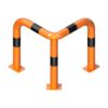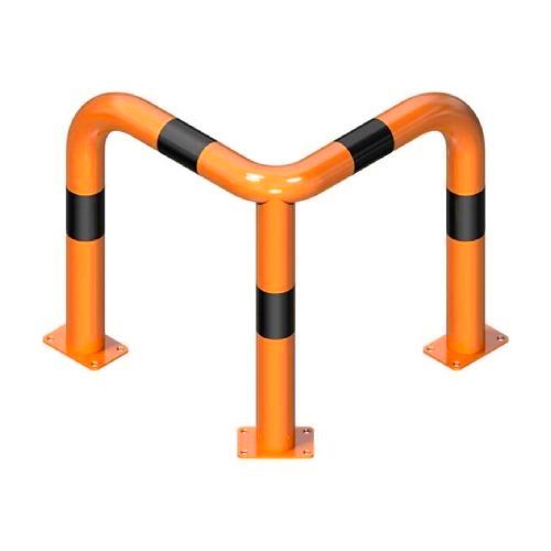 Metāla stūru aizsargbarjera – oranži dzeltena ar melnām joslām. Karsti cinkota un krāsota. Pie pamatnes skrūvējama ar 12 skrūvēm (skrūves neietilpst komplektā). Piemērota izmantošanai ārā. Izmēri: platums 600mm, augstums 650mm. Caurules diametrs – 76mm. Svars: 16kg.