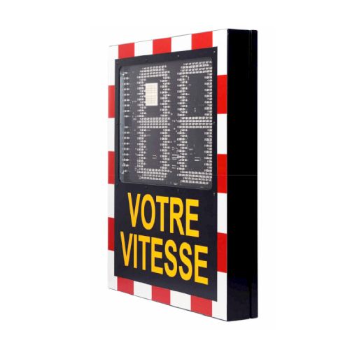 Mobilais ātruma radars. Izmēri: augstums 750mm, platums 640mm, biezums 80mm. Izturīgs alumīnija korpuss (pulverkrāsots). Korpuss izgatavots no 2mm alumīnija loksnes materiāla. Priekšējais vairogs no 5mm bieza polikarbonāta. Atstarojoša sarkanbalta uzlīme (1.atstarošanas klase). Priekšas noformējums pēc vajadzības. Mitrumizturība: IP56. Elastīgi stiprinājuma kronšteini. LED ciparu displejs – divkrāsu (h=320mm, sarkans/zaļš ar augstu spilgtumu: sarkans 8000mcd, zaļš 15000 mcd), sakārtots pēc viļņa garuma un intensitātes. Dzeltens/sarkans vai vienkrāsains LED ciparu displejs – kā opcija. Gaismas diode: CREE. LED daudzums: 480gab. Skata leņķis: 30 grādi. Lasīšanas attālums: 150-200m. Ātruma diapazons: 1-199km.h. Ātruma precizitāte: -1km/h. Mērījumu diapazons: līdz 120-150m (atkarībā no laika apstākļiem). Temperatūras diapazons: -30 līdz +60 grādi pēc Celsija. Komplektā iekļauts akumulators: 12V, 20Ah. Spilgtuma regulēšana. Radars aprīkots ar saules paneli 50/100W. Jaudas patēriņš gaistāves režīmā ir mazāks par 50mA pie 12V līdzstrāvas. Ātra un vienkārša uzstādīšana. Virziena radara sensors. Vienkārša un lietotājam draudzīga iestatīšana, neizmantojot datoru. Ātruma ierobežojuma iestatījums. Funkcija “bez displeja” virs ātruma ierobežojuma +40 (piemēram, 50 km/h ātruma ierobežojums + 40 km/h, tātad virs 90 km/h displejs ir melns). Funkcija “bez displeja” zem ātruma ierobežojuma (enerģijas taupīšanas funkcija saules enerģijai). LOW un HIGH filtra iestatījums.