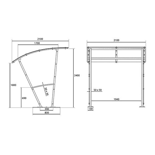 Nojume ar sānu sienām 5 velosipēdu novietošanai. Izmēri: platums 210cm, dziļums 210cm, augstums 240cm. Jumta seguma materiāls: polikarbnāts 8mm. Atbalsta struktūra: 50x50x2mm cinkota tērauda profili. Jumta struktūra: 50x30x2mm cinkota tērauda profili. Iespējams ievietot piecvietīgu velosipēdu statīvu HARRY, ADAM, ORTAL vai U-veida. Par papildus samaksu iespējams krāsot kādā no RAL krāsām.