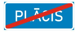 Norādījuma zīme Nr.522/Pilsētas vai ciema nosaukuma beigas. Zīmes izmērs ir atkarīgs no burtu daudzuma (nosaukuma garuma) un burtu augstuma. Minimālais izmērs 1000x400mm.
