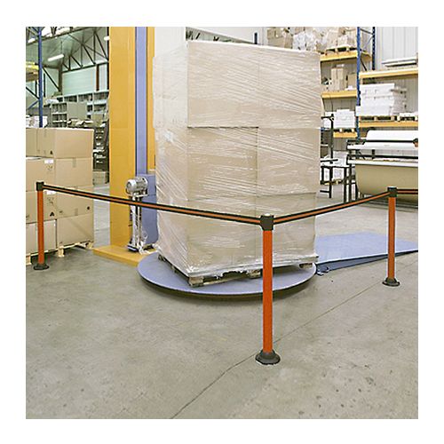 Norobežošanas lenta ar statīvu un pamatni. Lentas garums: 3m, lentas krāsas: sarkanbalta. Statīva krāsa: sarkana, statīva augstums 895mm, materiāls: krāsots, lakots alumīnijs d=60mm, statīva pamatnes d=150mm. Stiprināšana pie pamatne sar 3 skrūvēm. Svars: 2,3kg.