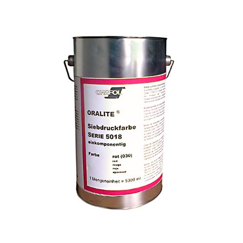 ORAFOL vienkomponenta sietspiedes krāsa uz solventa bāzes ORALITE® 5018 Screen Printing Ink, dzeltena (glancēta). Krāsa ir ātri žūstoša, gatava tūlītējai lietošanai. Piemērota lietošanai uz visām ORALITE® atstarojošajām līmplēvēm. Tilpums: 5L. Krāsa ir aizsargāta pret laikapstākļu maiņu (saule, lietus, sniegs utt.)
