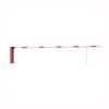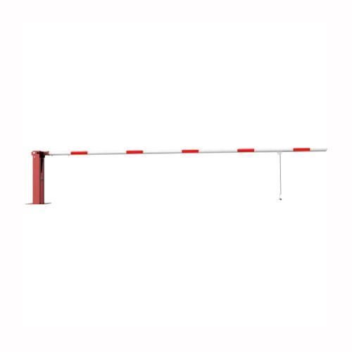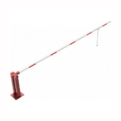 Paceļama barjera ar pneimatisko atsperi un eņģu atbalsta kāju. Atvēršana/aizslēgšana ar euro-profila cilindra slēdzeni (pieejama arī ar piekaramo atslēgu, trijstūrveida slēdzeni vai trijstūrveida slēdzenes mehānismu/euro-profila cilindra slēdzeni). Stiprināma pie pamatnes ar skrūvēm (iespējams arī iebetonēt – papildus nepieciešams betonējams enkurs: 360x360x8mm). Ieteicamie betona pamata izmēri galvenajam vertikālajam stabam 550x550x900mm. Izmēri: kopējais platums = 5000mm + 180mm, vidējais (brīvais) platums 5000mm, vertikālais galvenais stabs no 120x80mm tērauda caurules, pamatplāksne galvenajam stabam 360x360x8mm (karsti cinkots un krāsots sarkans), eņģu atbalsta kāja no alumīnija caurules, horizontālā barjera (alumīnija caurule ar biezām sieniņām) d=80mm, balta ar sarkanām atstarojošām joslām, augstums virs zemes 950mm. Bloķēšanas mehānisms: pie atbalsta staba, horizontālo stabu var fiksēt atvērtā un slēgtā stāvoklī. Iespējams papildus iegādāties galvenās atbalsta kājas enkurus montāžai betonā ar skrūvēm un metāla trosi, kā arī eiro profila cilindra slēdzene ar piespiedu aizvēršanu. Svars: 51.5kg.