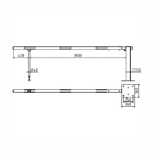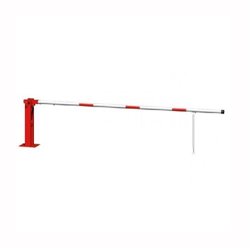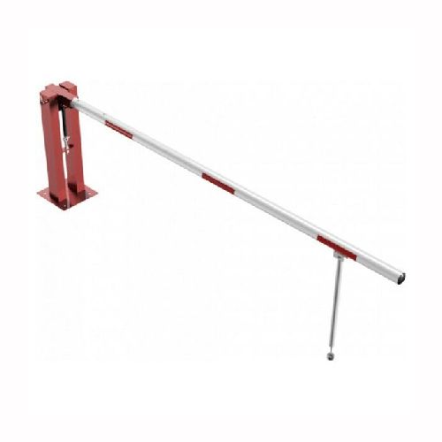 Paceļama barjera ar pneimatisko atsperi un eņģu atbalsta kāju. Atvēršana/aizslēgšana ar piekaramo atslēgu (pieejama arī ar trijstūrveida slēdzeni vai euro-profila cilindra slēdzeni). Stiprināma pie pamatnes ar skrūvēm (iespējams arī iebetonēt – papildus nepieciešams betonējams enkurs: 360x360x8mm). Ieteicamie betona pamata izmēri galvenajam vertikālajam stabam 550x550x900mm. Izmēri: kopējais platums = 3000mm + 180mm, vidējais (brīvais) platums 3000mm, vertikālais galvenais stabs no 120x80mm tērauda caurules, pamatplāksne galvenajam stabam 360x360x8mm (karsti cinkots un krāsots sarkans), eņģu atbalsta kāja no alumīnija caurules, horizontālā barjera (alumīnija caurule ar biezām sieniņām) d=80mm, balta ar sarkanām atstarojošām joslām, augstums virs zemes 950mm. Bloķēšanas mehānisms: pie atbalsta staba, horizontālo stabu var fiksēt atvērtā un slēgtā stāvoklī. Iespējams papildus iegādāties galvenās atbalsta kājas enkurus montāžai betonā ar skrūvēm un metāla trosi, kā arī eiro profila cilindra slēdzene ar piespiedu aizvēršanu. Svars: 45.5kg.
