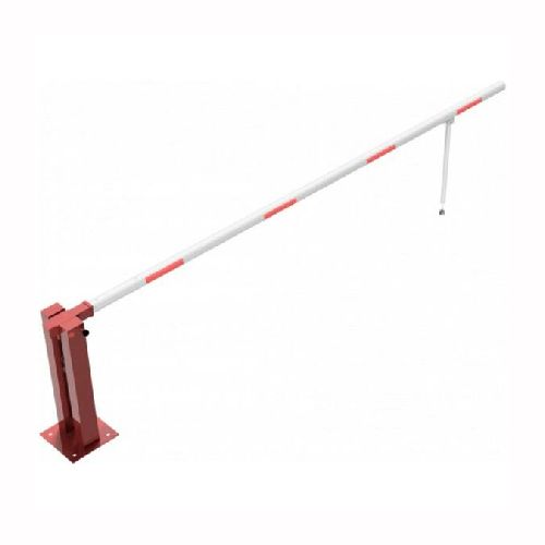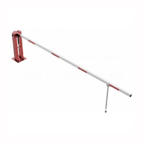 Paceļama barjera ar pneimatisko atsperi un eņģu atbalsta kāju. Atvēršana/aizslēgšana ar piekaramo atslēgu (pieejama arī ar trijstūrveida slēdzeni vai euro-profila cilindra slēdzeni). Stiprināma pie pamatnes ar skrūvēm (iespējams arī iebetonēt – papildus nepieciešams betonējams enkurs: 360x360x8mm). Ieteicamie betona pamata izmēri galvenajam vertikālajam stabam 550x550x900mm. Izmēri: kopējais platums = 4000mm + 180mm, vidējais (brīvais) platums 4000mm, vertikālais galvenais stabs no 120x80mm tērauda caurules, pamatplāksne galvenajam stabam 360x360x8mm (karsti cinkots un krāsots sarkans), eņģu atbalsta kāja no alumīnija caurules, horizontālā barjera (alumīnija caurule ar biezām sieniņām) d=80mm, balta ar sarkanām atstarojošām joslām, augstums virs zemes 950mm. Bloķēšanas mehānisms: pie atbalsta staba, horizontālo stabu var fiksēt atvērtā un slēgtā stāvoklī. Iespējams papildus iegādāties galvenās atbalsta kājas enkurus montāžai betonā ar skrūvēm un metāla trosi, kā arī eiro profila cilindra slēdzene ar piespiedu aizvēršanu. Svars: 48kg.