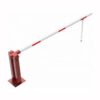 Paceļama barjera ar pneimatisko atsperi un eņģu atbalsta kāju. Atvēršana/aizslēgšana ar trijstūrveida slēdzeni (pieejama arī ar piekaramo atslēgu, euro-profila cilindra slēdzeni vai trijstūrveida slēdzenes mehānismu/euro-profila cilindra slēdzeni). Stiprināma pie pamatnes ar skrūvēm (iespējams arī iebetonēt – papildus nepieciešams betonējams enkurs: 360x360x8mm). Ieteicamie betona pamata izmēri galvenajam vertikālajam stabam 550x550x900mm. Izmēri: kopējais platums = 3000mm + 180mm, vidējais (brīvais) platums 3000mm, vertikālais galvenais stabs no 120x80mm tērauda caurules, pamatplāksne galvenajam stabam 360x360x8mm (karsti cinkots un krāsots sarkans), eņģu atbalsta kāja no alumīnija caurules, horizontālā barjera (alumīnija caurule ar biezām sieniņām) d=80mm, balta ar sarkanām atstarojošām joslām, augstums virs zemes 950mm. Bloķēšanas mehānisms: pie atbalsta staba, horizontālo stabu var fiksēt atvērtā un slēgtā stāvoklī. Iespējams papildus iegādāties galvenās atbalsta kājas enkurus montāžai betonā ar skrūvēm un metāla trosi, kā arī eiro profila cilindra slēdzene ar piespiedu aizvēršanu. Svars: 45.5kg.