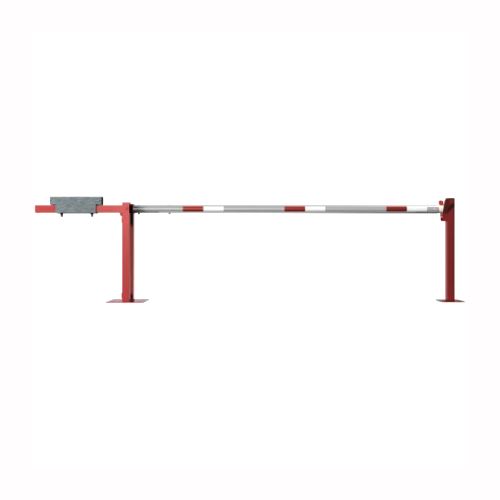 Paceļama barjera ar pretsvaru, ar atbalsta stabu. Atvēršana/aizslēgšana ar euro-profila cilindra slēdzeni (pieejama arī ar piekaramo atslēgu vai trijstūrveida slēdzeni). Stiprināma pie pamatnes ar skrūvēm (iespējams arī iebetonēt – papildus nepieciešama betonējamais enkurs abiem balstiem 360x360x8mm). Ieteicamie betona pamata izmēri galvenajam vertikālajam stabam 550x550x900mm; atbalsta stabam – 400x400x900mm. Izmēri: kopējais platums = 3000mm + 900mm, vidējais (brīvais) platums 3000mm, vertikālais stabs (karsti cinkots un krāsots sarkans), atbalsta stabs no tērauda caurules 70x70mm ar pamatnes plāksni 220x220x8mm, horizontālā barjera (alumīnija caurule ar biezām sieniņām) d=80mm, balta ar sarkanām joslām, augstums virs zemes 950mm. Bloķēšanas mehānisms: pie atbalsta staba, var fiksēt ar galveno atbalsta tapu, kad barjera ir atvērta. Iespējams papildus iegādāties atbalsta kāju enkurus montāžai betonā ar skrūvēm un metāla trosi. Svars: 74kg.