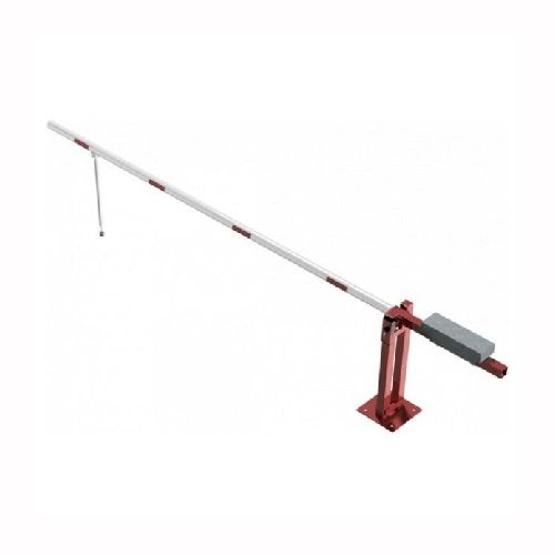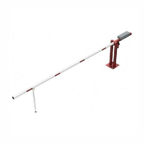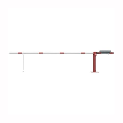Paceļama barjera ar pretsvaru, ar atbalsta kāju. Atvēršana/aizslēgšana ar euro-profila cilindra slēdzeni (pieejama arī ar piekaramo atslēgu vai trijstūrveida slēdzeni). Stiprināma pie pamatnes ar skrūvēm (iespējams arī iebetonēt – papildus nepieciešama betonējamais enkurs balstam 360x360x8mm). Ieteicamie betona pamata izmēri galvenajam vertikālajam stabam 550x550x900mm. Izmēri: kopējais platums = 4000mm + 900mm, vidējais (brīvais) platums 4000mm, vertikālais stabs (karsti cinkots un krāsots sarkans), atbalsta stabs no alumīnija, horizontālā barjera (alumīnija caurule ar biezām sieniņām) d=80mm, balta ar sarkanām joslām, augstums virs zemes 950mm. Bloķēšanas mehānisms: pie galvenā atbalsta staba bloķēšanas tapa, horizontālās barjeras nostiprināšanai atvērtā vai slēgta pozīcija. Iespējams papildus iegādāties atbalsta kāju enkuru montāžai betonā un metāla trosi. Svars: 90kg.