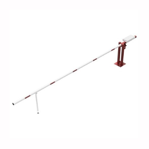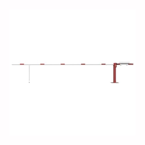 Paceļama barjera ar pretsvaru, ar atbalsta kāju. Atvēršana/aizslēgšana ar euro-profila cilindra slēdzeni (pieejama arī ar piekaramo atslēgu vai trijstūrveida slēdzeni). Stiprināma pie pamatnes ar skrūvēm (iespējams arī iebetonēt – papildus nepieciešama betonējamais enkurs balstam 360x360x8mm). Ieteicamie betona pamata izmēri galvenajam vertikālajam stabam 550x550x900mm. Izmēri: kopējais platums = 5000mm + 900mm, vidējais (brīvais) platums 5000mm, vertikālais stabs (karsti cinkots un krāsots sarkans), atbalsta stabs no alumīnija, horizontālā barjera (alumīnija caurule ar biezām sieniņām) d=80mm, balta ar sarkanām joslām, augstums virs zemes 950mm. Bloķēšanas mehānisms: pie galvenā atbalsta staba bloķēšanas tapa, horizontālās barjeras nostiprināšanai atvērtā vai slēgta pozīcija. Iespējams papildus iegādāties atbalsta kāju enkuru montāžai betonā un metāla trosi. Svars: 114kg.