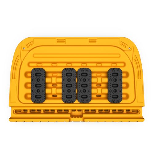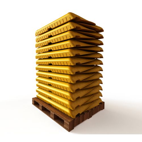 Pagaidu PVC uzbrauktuve (rampa), dzeltena. Izmēri: garums 1199mm, platums 766mm, augstums 123mm. Var uzstādīt rampu uz min. 75mm, max. 125mm augstumā. Pretslīdoša virsma. Iztur slodzi līdz 350kg. Augsta triecienizturība. Pārstrādājama. Izgatavota no augsta blīvuma polietilēna un PVC materiāla. Svars: 13.2kg.