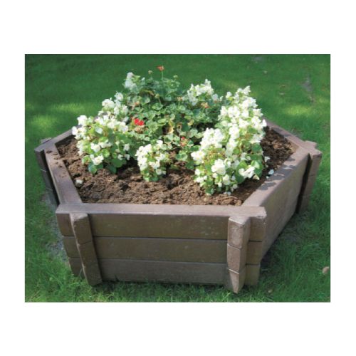 Pārstrādātas plastmasas puķu pods (sešstūra formas). Izmēri: ārējais diametrs 1080mm, garums 620mm, augstums 440mm (ar papildus paaugstinājumiem 1080x620x120mm var pagarināt puķu poda augstumu – paaugstinājums iegādājams atsevišķi), pamatnes biezums 20mm, pamatnes h=60mm, sānu profils 60x120mm. Citi izmēri pēc pieprasījuma. Krāsa: brūna. Izgatavots no pārstrādātas plastmasas. Brīvi stāvošs. Svars: 86kg. Tilpums: 181l. Piemērots publiskās un komerciālās vietās, privātās vietās – gājēju zonās, autosstāvvietās, degvielas uzpildes stacijās, meža takās, parkos u.c. Puķu pods tiek piegādāts samontētā veidā. Ražots Vācijā.