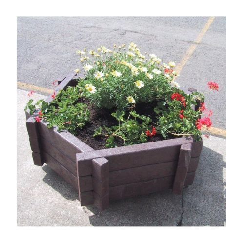 Pārstrādātas plastmasas puķu pods (sešstūra formas). Izmēri: ārējais diametrs 1390mm, garums 780mm, augstums 440mm (ar papildus paaugstinājumiem 1390x780x120mm var pagarināt puķu poda augstumu – paaugstinājums iegādājams atsevišķi), pamatnes biezums 20mm, pamatnes h=60mm, sānu profils 60x120mm. Citi izmēri pēc pieprasījuma. Krāsa: brūna. Izgatavots no pārstrādātas plastmasas. Brīvi stāvošs. Svars: 117kg. Tilpums: 337l. Piemērots publiskās un komerciālās vietās, privātās vietās – gājēju zonās, autosstāvvietās, degvielas uzpildes stacijās, meža takās, parkos u.c. Puķu pods tiek piegādāts samontētā veidā. Ražots Vācijā.