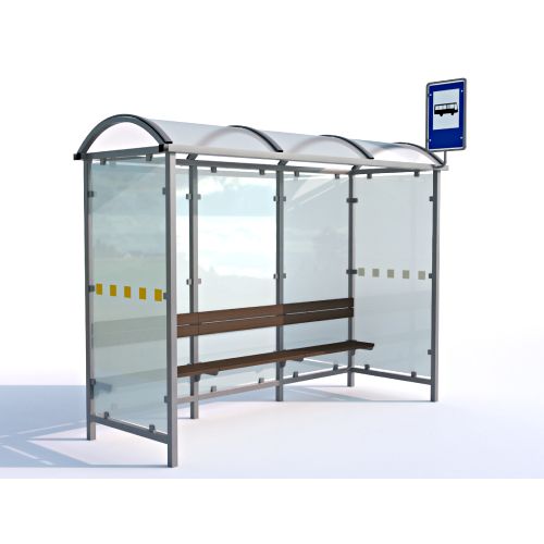 Pieturu nojume. Izmēri: garums 3150mm, kopējais dziļums 1150mm, apakšējās pamatnes dziļums 1050mm. Konstrukcija izgatavota no cinkota tērauda ar pulverkrāsojumu (iespējams arī nerūsējošā tērauda variants – par papildus samaksu!). Soliņam skujkoka dēlīši (piesūcināti, divkārši lakoti), kas garantē izturību pret laika apstākļiem. Jumta materiāls: 8mm caurspīdīgs šūnu polikarbonāts; sienām – 8mm rūdīts stikls. Papildus iespēja nojumi aprīkot ar atkritumu tvertnēm, reklāmas blokiem, informācijas dēļiem u.c. aksesuāriem. Montāžas veidi: pieskrūvējama pie pamatnes vai betonējama (nepieciešamo veidu norādīt pie pasūtījuma veikšanas!). Svars: 128kg. Iespējamie koka dēlīšu toņi: palisandrs, gaišs ozols vai PVC ar tērauda iekšpusi. Metāla konstrukcijas pēc RAL toņa.