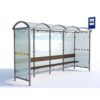 Pieturu nojume. Izmēri: garums 4200mm, kopējais dziļums 1150mm, apakšējās pamatnes dziļums 1050mm. Konstrukcija izgatavota no cinkota tērauda ar pulverkrāsojumu (iespējams arī nerūsējošā tērauda variants – par papildus samaksu!). Soliņam skujkoka dēlīši (piesūcināti, divkārši lakoti), kas garantē izturību pret laika apstākļiem. Jumta materiāls: 8mm caurspīdīgs šūnu polikarbonāts; sienām – 8mm rūdīts stikls. Papildus iespēja nojumi aprīkot ar atkritumu tvertnēm, reklāmas blokiem, informācijas dēļiem u.c. aksesuāriem. Montāžas veidi: pieskrūvējama pie pamatnes vai betonējama (nepieciešamo veidu norādīt pie pasūtījuma veikšanas!). Svars: 155kg. Iespējamie koka dēlīšu toņi: palisandrs, gaišs ozols vai PVC ar tērauda iekšpusi. Metāla konstrukcijas pēc RAL toņa.