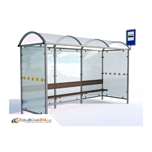 Pieturu nojume. Izmēri: garums 3150mm, kopējais dziļums 1450mm, apakšējās pamatnes dziļums 1350mm. Konstrukcija izgatavota no cinkota tērauda ar pulverkrāsojumu (iespējams arī nerūsējošā tērauda variants – par papildus samaksu!). Soliņam skujkoka dēlīši (piesūcināti, divkārši lakoti), kas garantē izturību pret laika apstākļiem. Jumta materiāls: 8mm caurspīdīgs šūnu polikarbonāts; sienām – 8mm rūdīts stikls. Papildus iespēja nojumi aprīkot ar atkritumu tvertnēm, reklāmas blokiem, informācijas dēļiem u.c. aksesuāriem. Montāžas veidi: pieskrūvējama pie pamatnes vai betonējama (nepieciešamo veidu norādīt pie pasūtījuma veikšanas!). Svars: 159kg. Iespējamie koka dēlīšu toņi: palisandrs, gaišs ozols vai PVC ar tērauda iekšpusi. Metāla konstrukcijas pēc RAL toņa.