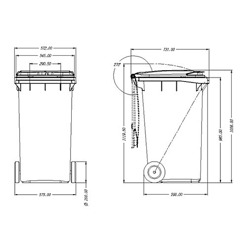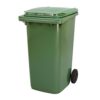 Plastmasas atkritumu konteiners uz 2 riteņiem. Konteinera tilpums: 240l. Celtspēja: 80kg. Krāsa: zaļa. Izmēri: platums 575mm, augstums 1056mm, dziļums 731mm. Riteņu d=200mm. Konteiners noturīgs pret UV starojumu. Ražots no videi draudzīga materiāla – polietilēna. Svars: 15kg.