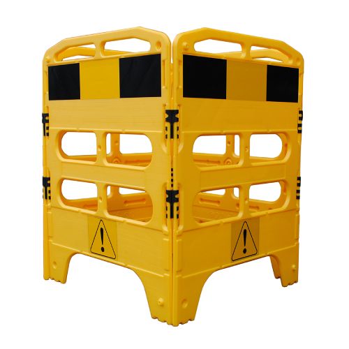 Plastmasas barjera, četrdaļīga. Krāsa: dzeltena. Barjeras posma garums 1000mm, kopējais garums 4000mm, augstums 1000mm. Barjeras pieejamas dažādās krāsās. Ražots no 100% pārstrādājama materiāla. Viegla un izturīga. Svars: 16kg.