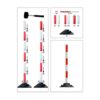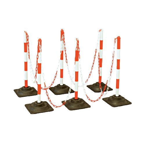 Plastmasas ķēdes stabiņu komplekts (6gab.) ar PVC pēdām. Izmēri:(290×290)x860mm. Ātri saliekams no posmiem un savienojams ar pēdu (vītne M36). Augšpusē iespējams iekarināt ķēdi uz 4 pusēm. Karstumizturība no -20ºC līdz +60ºC. Lietošanai iekštelpās un īslaicīgai lietošanai ārā. Krāsa: balta/sarkana. Svars: 1.96kg.