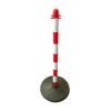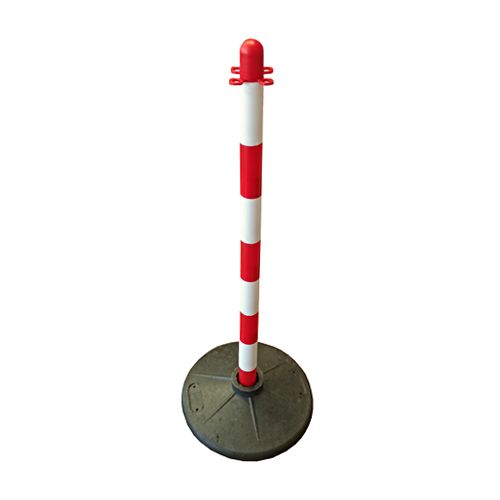 Plastmasas ķēdes stabiņš ar PVC pēdu. Izmēri: augstums 90cm, pēdas diametrs 34cm. Stabiņa krāsa: balta ar sarkanām joslām. Augšpusē iespējams iekarināt ķēdi uz 4 pusēm.