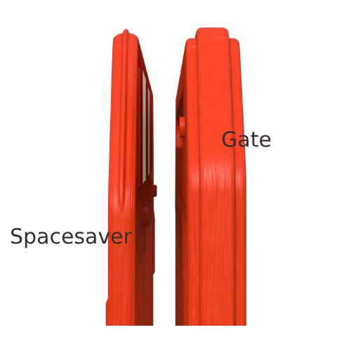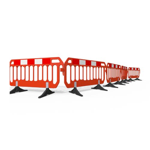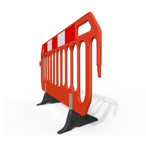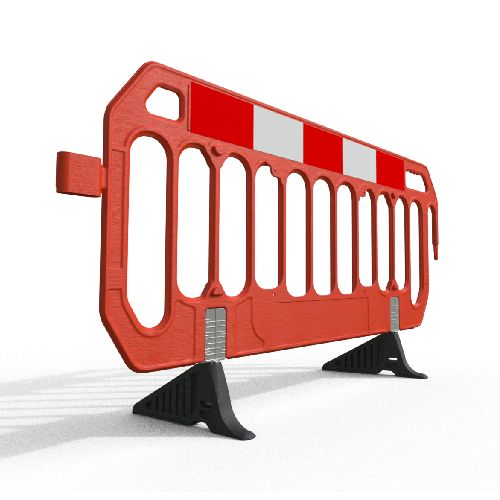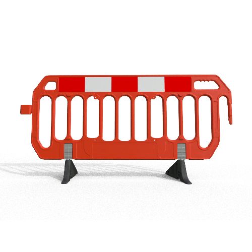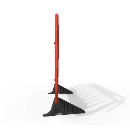 PVC barjera SPACE SAVER (plāna), oranža ar ne-standarta (Anti-Trip) pēdām. Garums: 2000mm, augstums 1000mm, biezums 25mm. Svars ar Anti-Trip pēdām 8.2kg. Izgatavota no UV stabila HDPE. 100% pārstrādājama. Uz paletes: 80gab.