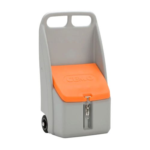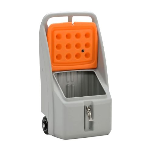 Ratiņi smilts/sāls vai citu materiālu uzglabāšanai un pārvietošanai. Tilpums: 70L. Ar vāku un izturīgiem gumijas riteņiem. Izmēri: 1070x590x390mm. Ergonomisks rokturis. Vāks fiksēts vertikālā stāvoklī. Viegli tīrāms. Izgatavots no ķīmiski izturīga PE (100% pārstrādājams). Atsevišķi iespējams iegādāties tvertnes atdalītāju (var uzglabāt divus dažādus materiālus).