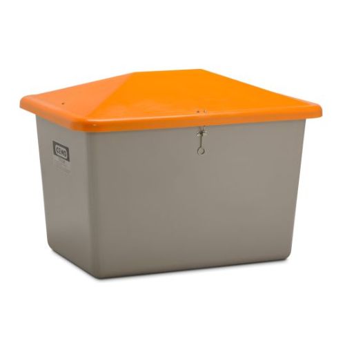 Smilts/sāls konteiners. Ietilpība: 700l. Krāsa: pelēka ar oranžu vāku. Izmēri: garums 1340mm, platums 990mm, augstums 960mm. Izgatavots no pastiprinātas stiklšķiedras. Ar noņemamām vāka stiprinājuma siksnām. Korozijas un laika apstākļu izturīgs. Piemērots smilts, sāls vai kāda cita materiāla uzglabāšanai ziemas/vasaras periodos. Svars: 30kg.