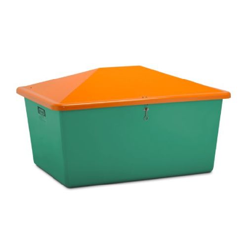 Smilts/sāls konteiners. Ietilpība: 1500l. Krāsa: zaļa ar oranžu vāku. Izmēri: garums 1840mm, platums 1430mm, augstums 1040mm. Izgatavots no pastiprinātas stiklšķiedras. Ar nerūsējošā tērauda slēdzamiem vāka balstiem. Korozijas un laika apstākļu izturīgs. Piemērots smilts, sāls vai kāda cita materiāla uzglabāšanai ziemas/vasaras periodos. Svars: 70kg.