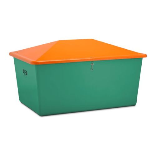 Smilts/sāls konteiners. Ietilpība: 2200l. Krāsa: zala ar oranžu vāku. Izmēri: garums 2130mm, platums 1520mm, augstums 1240mm. Izgatavots no pastiprinātas stiklšķiedras. Ar nerūsējošā tērauda slēdzamiem vāka balstiem. Korozijas un laika apstākļu izturīgs. Piemērots smilts, sāls vai kāda cita materiāla uzglabāšanai ziemas/vasaras periodos. Svars: 92kg.