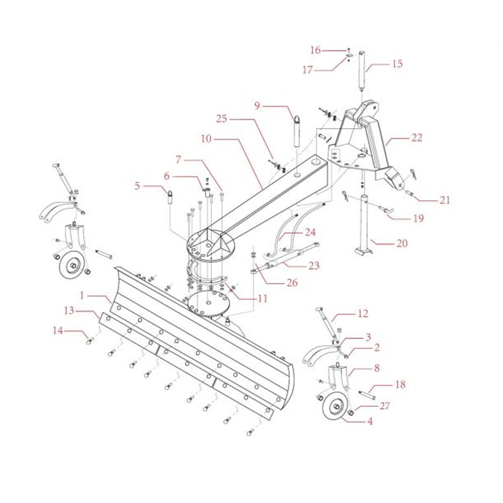 Sniega lāpsta ar greideri (uz 2 riteņiem). Darba platums 2500mm. Augstums 630mm. Divvirzienu asmens. Ar hidraulisko cilindru var mainīt lāpstas asmens darba leņķi (darbojas arī manuāli) vai pagriezt to par 360°. Lāpsta ar jaudīgu asmeni, 5 dažādi darba leņķi. Piestiprināms pie traktora trīspunktu sasaistes (2.kategorija). Asmeni var iestatīt trīs dažādos darba leņķos darbam uz priekšu un trīs dažādos stāvokļos darbam atpakaļ. Atbalsta riteņus ir viegli savietot ar tapu un, tīrot sniegu, regulēt pareizo darba augstumu un asmens leņķi. Tiek piegādāts iepakots kastē. Nomaināms nodilušais asmens (nazis), stabilizatori, atbalsta riteņi, hidrauliskie cilindri, hidrauliskās šļūtenes un pacelšanas roku tapas. Svars: 430kg.