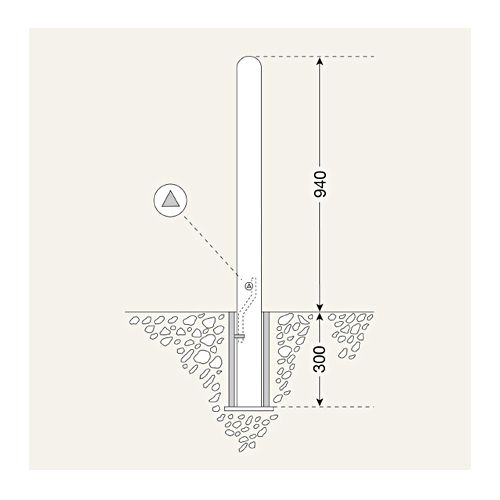 Tērauda stabs MINCHEN – ar trijstūrveida atslēgu, ar 1 ķēdes cilpu, betonējams. Krāsa: antīkbrūna (RAL 8019). Izmēri: 90x90mm, augstums virs pamatnes 940mm, augstums zem pamatnes 300mm. Svars: 16kg.