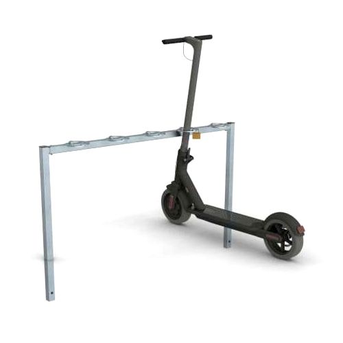 Statīvs 5 skrejriteņiem. Betonējams. Karsti cinkots. Izmēri: kopējais garums 1500mm, augstums 650mm (speciāli gredzeni, kur ievieto skrejriteni, lai to aizslēgtu ar piekaramo atslēgu). Izgatavots no 40x40mm kvadrātcaurulēm. Svars: 13kg.