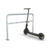 Statīvs 5 skrejriteņiem. Montējams pie pamatnes ar skrūvēm. Karsti cinkots. Izmēri: kopējais garums 1500mm, augstums 650mm (speciāli gredzeni, kur ievieto skrejriteni, lai to aizslēgtu ar piekaramo atslēgu), kopējais augstums 1000mm. Izgatavots no d=48mm metāla caurules. Svars: 15kg.