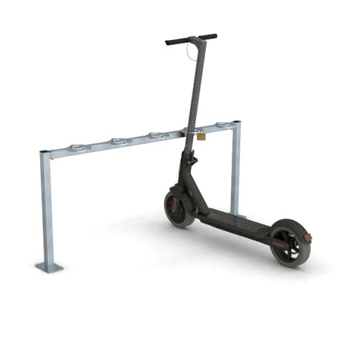 Statīvs 5 skrejriteņiem. Montējams pie pamatnes ar skrūvēm. Karsti cinkots. Izmēri: kopējais garums 1500mm, augstums 650mm (speciāli gredzeni, kur ievieto skrejriteni, lai to aizslēgtu ar piekaramo atslēgu). Izgatavots no 40x40mm kvadrātcaurulēm. Svars: 13kg.