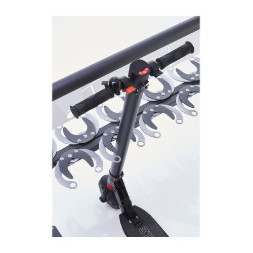 Statīvs 6 skrejriteņiem. Stiprināms pie sienas ar skrūvēm (neietilpst komplektā!). Skrejritenis pie stūres caurules tiek nostiprināts ar klipšu saspiešanas sistēmu, ko var nostiprināt ar troses vai U-veida slēdzeni (nav iekļauts komplektācijā). Saspiešanas sistēmā var ievietot skrejriteņa cauruli ar maksimālo d=70mm. Statīvs aprīkots ar 2 sienas plāksnēm (150x150mm; katrā plāksnē 4 caurumi d=11mm), lai to piestiprinātu pie sienas. Izgatavots no d=30mm tērauda caurules, kas krāsots antracīta melnā poliestera krāsā ar gaiši pelēkiem klipšiem. Slēdzenes atveres d=20mm. Kopējie izmēri: garums 1060mm, dziļums 245mm, augstums 150mm. Svars: 11kg.